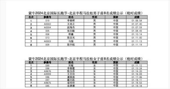 ·2024北京半程馬拉松男女組前8名成績公示。