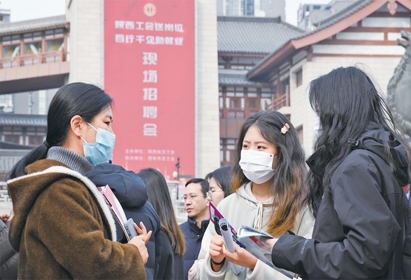 2024年3月6日,由陜西省總工會(huì)舉辦的2024年陜西工會(huì)“春送崗位”就業(yè)服務(wù)月啟動(dòng)儀式在西安舉行。與啟動(dòng)儀式同期舉辦的現(xiàn)場(chǎng)招聘會(huì)吸引約200家用人單位參加,提供崗位超過(guò)5000個(gè)。圖為當(dāng)日求職者在現(xiàn)場(chǎng)招聘會(huì)上與企業(yè)工作人員交流。 新華社記者 張博文/攝