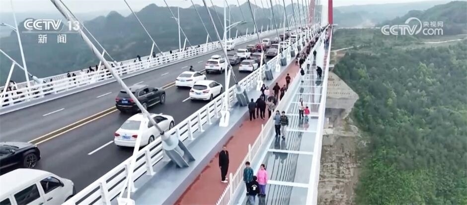 除了一些名勝古跡,這個(gè)假期,許多地方的新景觀也成為人們打卡的熱門地。在貴州,剛剛通車不久的龍里河大橋吸引了不少游客。人們登上大橋,沿著玻璃步道,體驗(yàn)在云端漫步,領(lǐng)略山地峽谷的自然風(fēng)光,游客們紛紛拍照打卡。