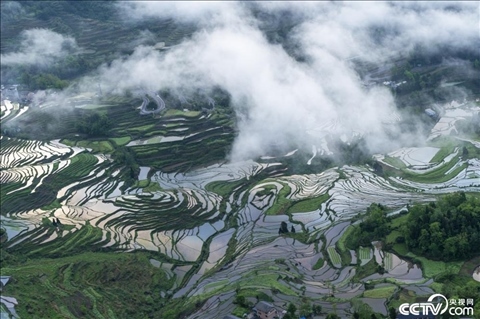 2024年5月5日,重慶酉陽(yáng)花田鄉(xiāng)何家?guī)r村萬畝灌水梯田等待插秧,鄉(xiāng)村云霧繚繞風(fēng)景如畫。