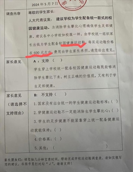 ·學(xué)校發(fā)調(diào)查表詢問家長(zhǎng)“是否支持統(tǒng)一購(gòu)置約600元一雙的運(yùn)動(dòng)鞋”,淮北市教育局澄清:只是采集信息,沒其他意圖。
