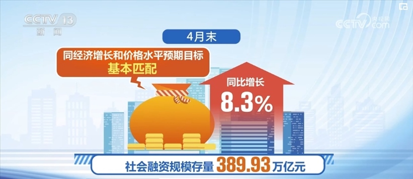 4月末,社會融資規(guī)模存量389.93萬億元,同比增長8.3%,同經(jīng)濟增長和價格水平預(yù)期目標基本匹配。1—4月,社會融資規(guī)模增量累計為12.73萬億元,處于歷史同期較高水平。