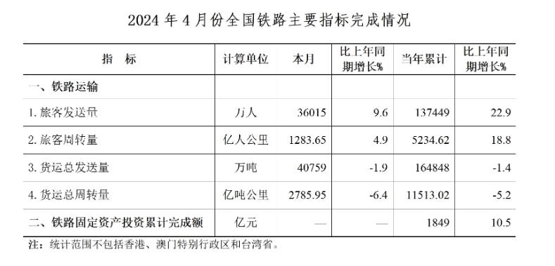 央視網(wǎng)消息:據(jù)國家鐵路局消息,4月,全國鐵路旅客發(fā)送量36015萬人,同比增長9.6%。鐵路固定資產(chǎn)投資累計完成1849億元,同比增長10.5%。