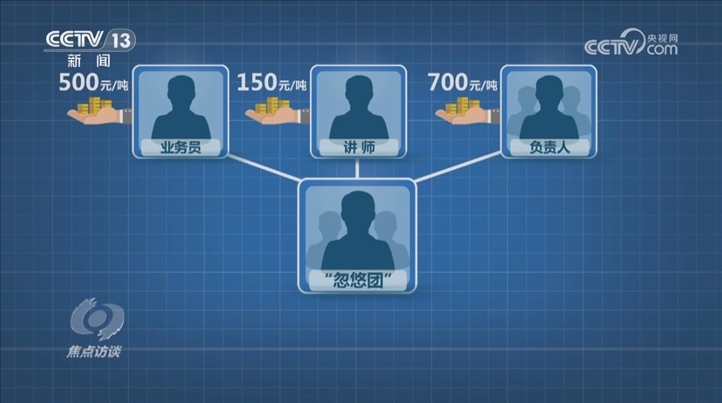 氯化銨和硫酸銨都屬于氮肥的生產(chǎn)原料,成本價約為800—900元/噸。據(jù)專案組調(diào)查,幾個代工廠將原料簡單攪拌裝袋后,賣給定制化肥的總經(jīng)銷商張某華,價格就變成1100—1200元/噸,中間差價約300元/噸;總經(jīng)銷商張某華把化肥交付給代理商張某昌,價格為1375元/噸,差價約200元/噸;張某昌轉(zhuǎn)賣給實體“忽悠團”的價格為1900元/噸,中間差價約500元/噸;“忽悠團”賣給農(nóng)戶的最終價格為3250元/噸,其中:業(yè)務員每噸抽成500元,講師每噸抽成150元,“忽悠團”幾位負責人每噸獲利700元。就這樣,每噸成本不到1000元的氮肥,披著復合肥的外衣,在農(nóng)戶手里翻了三倍多。