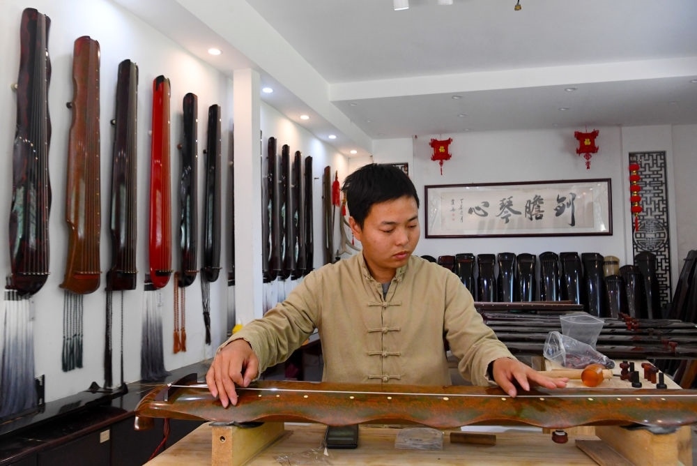 在堌陽鎮(zhèn)徐場村,沿街宅院里傳出打磨木材和動聽的琴瑟之聲。尋聲踏入小院,“90后”琴師徐亞沖正撥動琴弦,調(diào)試古琴?!爸魄俨粌H是我們致富的門路,彈琴已成為我們的新生活方式。”