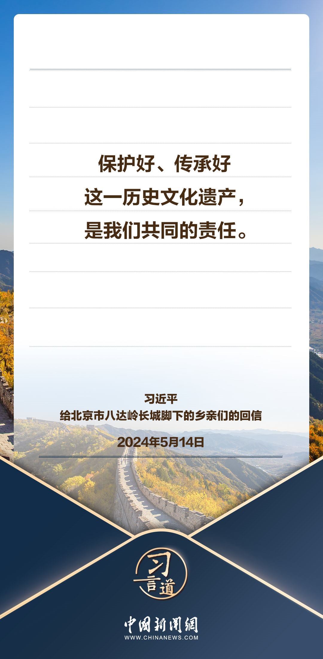 中共中央總書記、國家主席、中央軍委主席習近平5月14日給北京市延慶區(qū)八達嶺鎮(zhèn)石峽村的鄉(xiāng)親們回信,向他們致以誠摯問候并提出殷切期望。習近平指出——