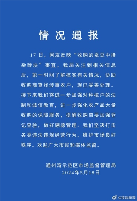 ·網(wǎng)友反映“收購的蠶豆中摻雜磚塊”,南通發(fā)布情況通報。