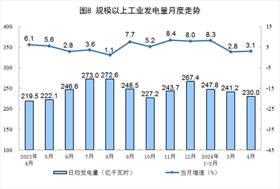 電力生產(chǎn)增速有所加快。4月份,規(guī)上工業(yè)發(fā)電量6901億千瓦時,同比增長3.1%,增速比3月份加快0.3個百分點;日均發(fā)電230.0億千瓦時。1—4月份,規(guī)上工業(yè)發(fā)電量29329億千瓦時,同比增長6.1%。