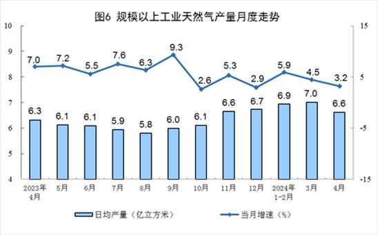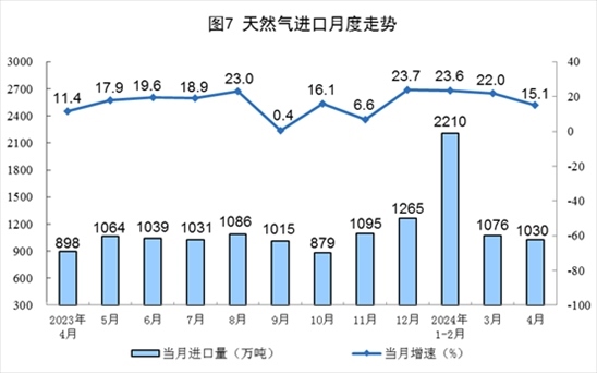 天然氣生產(chǎn)穩(wěn)定增長,進口保持較快增長。4月份,規(guī)上工業(yè)天然氣產(chǎn)量198億立方米,同比增長3.2%,增速比3月份放緩1.3個百分點;日均產(chǎn)量6.6億立方米。進口天然氣1030萬噸,同比增長15.1%。