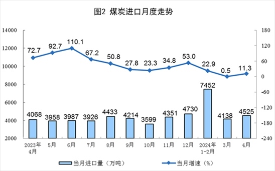 原煤生產(chǎn)降幅收窄,進口明顯回升。4月份,規(guī)上工業(yè)原煤產(chǎn)量3.7億噸,同比下降2.9%,降幅比3月份收窄1.3個百分點;日均產(chǎn)量1239萬噸。進口煤炭4525萬噸,同比增長11.3%。