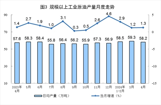 原油生產(chǎn)平穩(wěn)增長,進口由降轉(zhuǎn)增。4月份,規(guī)上工業(yè)原油產(chǎn)量1747萬噸,同比增長1.3%,增速比3月份加快0.1個百分點;日均產(chǎn)量58.2萬噸。進口原油4472萬噸,同比增長5.9%。