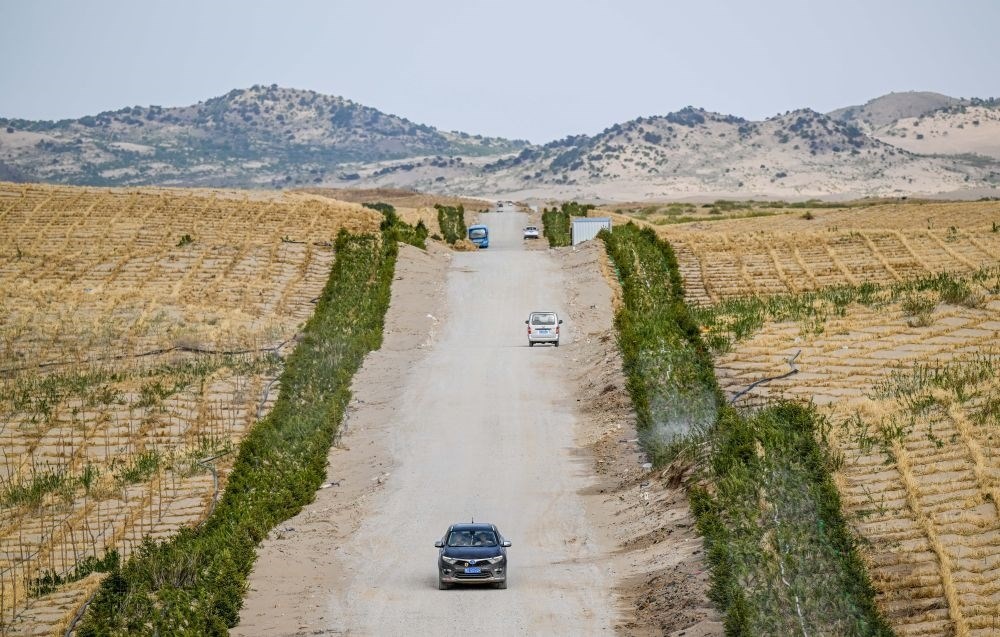 ?在內(nèi)蒙古赤峰市翁牛特旗巴彥呼交嘎查其白線防沙治沙項目區(qū),穿沙公路將沙地切割,沙丘被逐步固定(2024年5月16日攝,無人機(jī)照片)。新華社記者 連振 攝