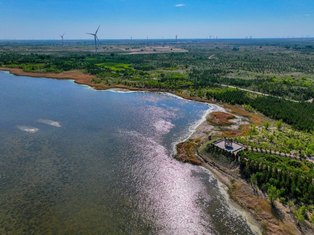 ?這是在內(nèi)蒙古通遼市科爾沁沙地“雙百萬畝”綜合治理工程努古斯臺項目區(qū)拍攝的風(fēng)力發(fā)電機(jī)組(2024年5月15日攝,無人機(jī)照片)。新華社記者 連振 攝