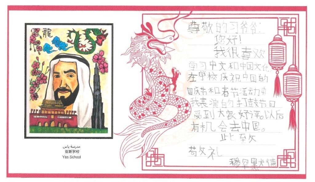 想邀請習(xí)爺爺來阿聯(lián)酋、想和習(xí)爺爺踢一場足球賽、希望能在阿聯(lián)酋動物園里看到大熊貓……在這些精心制作的信箋里,孩子們用中文一筆一劃認(rèn)真書寫自己的心里話,童心與真情躍然紙上。長城、中國龍、大熊貓、祥云、燈籠,孩子們還用五彩斑斕的畫筆表達(dá)自己對中國的向往和喜愛,可謂圖文并茂,賞心悅目。