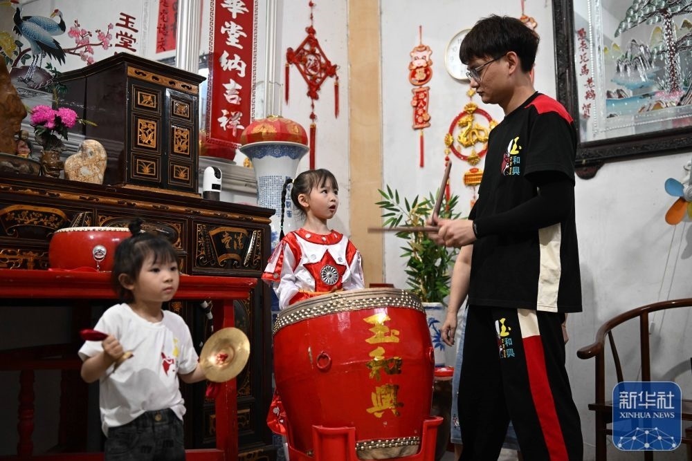 5月29日,在汕頭市貴嶼鎮(zhèn)玉窖村的家中,父親莊镕強(右)指導(dǎo)莊恩琪(中)和妹妹莊雅琪練習(xí)“敲鑼打鼓”。