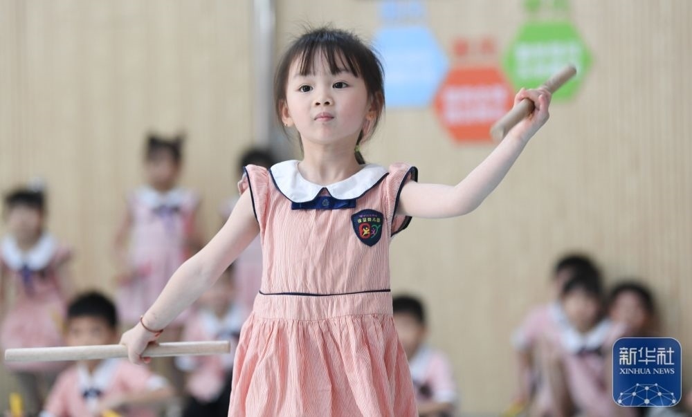 5月29日,在汕頭市貴嶼鎮(zhèn)北林保嬰幼兒園,莊恩琪(前)練習(xí)跳英歌舞。