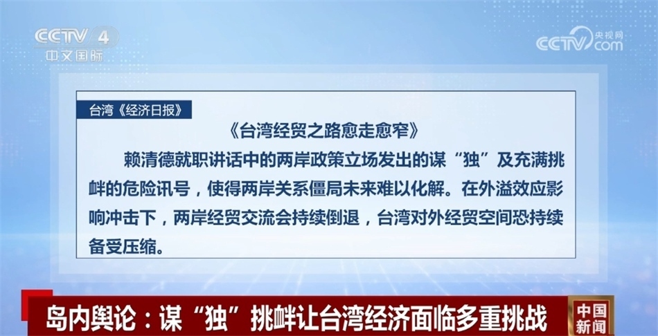 臺灣《經(jīng)濟日報》近日發(fā)表題為《臺灣經(jīng)貿(mào)之路愈走愈窄》的社論指出,賴清德就職講話中的兩岸政策立場發(fā)出的謀“獨”及充滿挑釁的危險訊號,使得兩岸關(guān)系僵局未來難以化解。在外溢效應影響沖擊下,兩岸經(jīng)貿(mào)交流會持續(xù)倒退,臺灣對外經(jīng)貿(mào)空間恐持續(xù)備受壓縮。