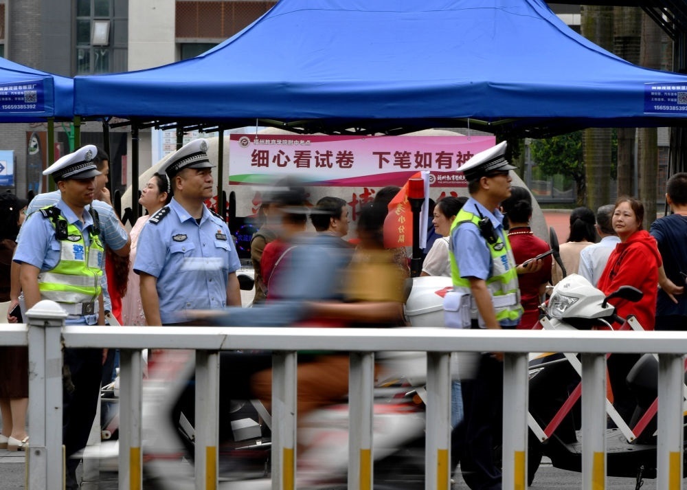 ↑6月7日,在福建福州鼓樓考區(qū)福州教育學(xué)院附屬中學(xué)考點(diǎn),公安交警在維持考場(chǎng)周邊秩序。