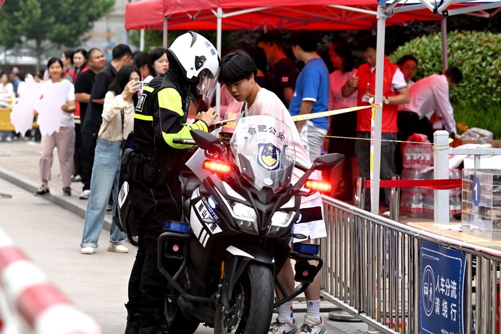 ↑6月7日,民警護(hù)送一名考生順利抵達(dá)安徽合肥市五十中學(xué)天鵝湖教育集團(tuán)天鵝湖校區(qū)考點(diǎn)。