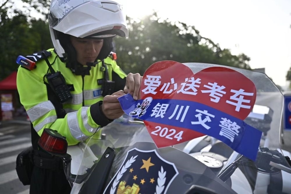 ↑6月7日,寧夏銀川市公安局交通警察分局興慶區(qū)交警一大隊(duì)民警在準(zhǔn)備愛(ài)心送考車輛。