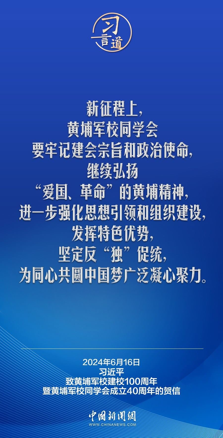 在黃埔軍校建校100周年暨黃埔軍校同學(xué)會(huì)成立40周年之際,中共中央總書記、國(guó)家主席、中央軍委主席習(xí)近平發(fā)來賀信,代表中共中央向黃埔軍校同學(xué)會(huì)表示熱烈祝賀,向廣大海內(nèi)外黃埔同學(xué)及其親屬致以誠(chéng)摯問候。習(xí)近平指出——