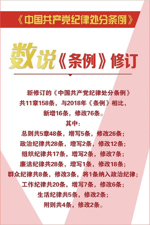 2023年新修訂的《中國共產(chǎn)黨紀(jì)律處分條例》,與時(shí)俱進(jìn)完善紀(jì)律規(guī)范,與2018年《條例》相比,新增16條,修改76條,進(jìn)一步扎緊織密制度籠子。