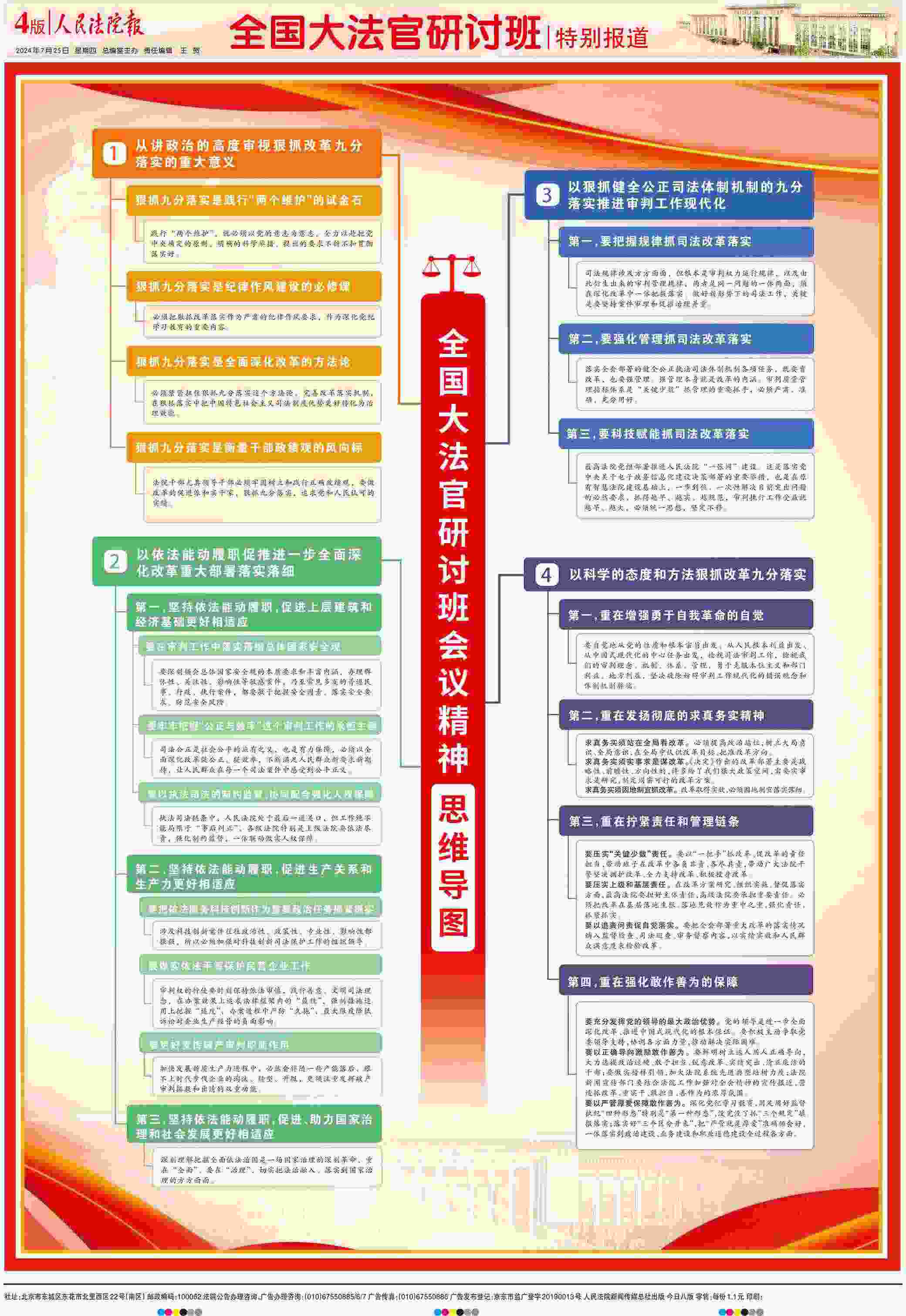7月24日,全國大法官研討班舉行。此次研討班的主要任務(wù)是:堅持以習(xí)近平新時代中國特色社會主義思想為指導(dǎo),全面貫徹落實黨的二十大和二十屆二中、三中全會精神,深入貫徹習(xí)近平法治思想,認(rèn)真學(xué)習(xí)領(lǐng)會黨中央關(guān)于進(jìn)一步全面深化改革的戰(zhàn)略部署,深化思想認(rèn)識,狠抓九分落實,加快推進(jìn)審判工作現(xiàn)代化,努力為以中國式現(xiàn)代化全面推進(jìn)強(qiáng)國建設(shè)、民族復(fù)興偉業(yè)提供有力司法服務(wù)保障。