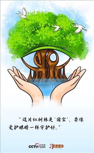 “國寶”一詞強(qiáng)調(diào)了紅樹林不可估量的價值,及其在國家發(fā)展中的重要地位?!跋駩圩o(hù)眼睛一樣守護(hù)好”,則重申了保護(hù)紅樹林的緊迫性和重要性。