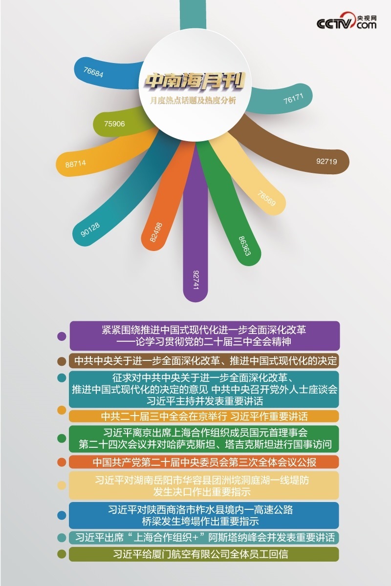 央視網(wǎng)“智聞”系統(tǒng)提取分析2024年7月全網(wǎng)時(shí)政新聞熱點(diǎn)顯示,本月“中共中央關(guān)于進(jìn)一步全面深化改革、推進(jìn)中國(guó)式現(xiàn)代化的決定”“中共二十屆三中全會(huì)在京舉行 習(xí)近平作重要講話”等話題備受關(guān)注。