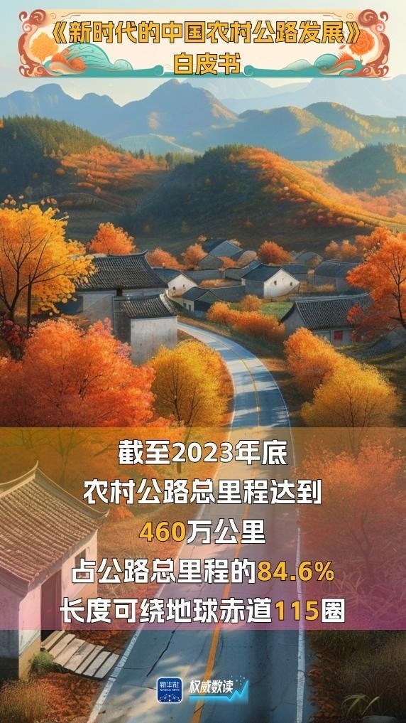 國(guó)務(wù)院新聞辦公室29日發(fā)布的《新時(shí)代的中國(guó)農(nóng)村公路發(fā)展》白皮書(shū)顯示,截至2023年底,我國(guó)農(nóng)村公路總里程增長(zhǎng)到460萬(wàn)公里,占公路總里程的84.6%,目前已形成了“外通內(nèi)聯(lián)、通村暢鄉(xiāng)、客車(chē)到村、安全便捷”的農(nóng)村交通運(yùn)輸網(wǎng)絡(luò),帶動(dòng)農(nóng)村地區(qū)整體面貌發(fā)生了巨大變化。