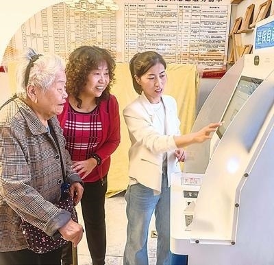 劉紅菊(右)幫助社區(qū)老人在社保自助終端辦理業(yè)務(wù)。本報(bào)記者 朱 磊攝