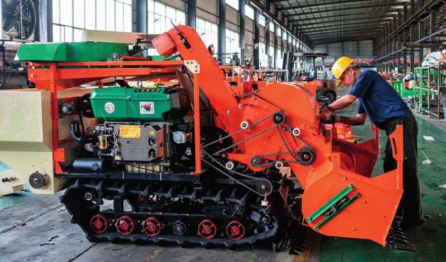 湖南省婁底市雙峰縣湖南湘源金穗智能裝備有限公司工人在組裝小型收割機(2024年9月11日攝)。陳思汗攝/本刊