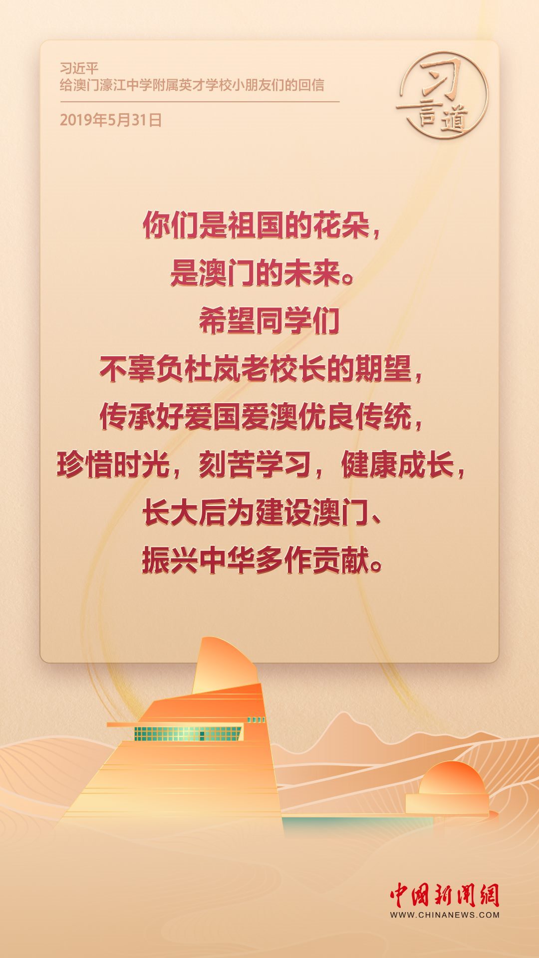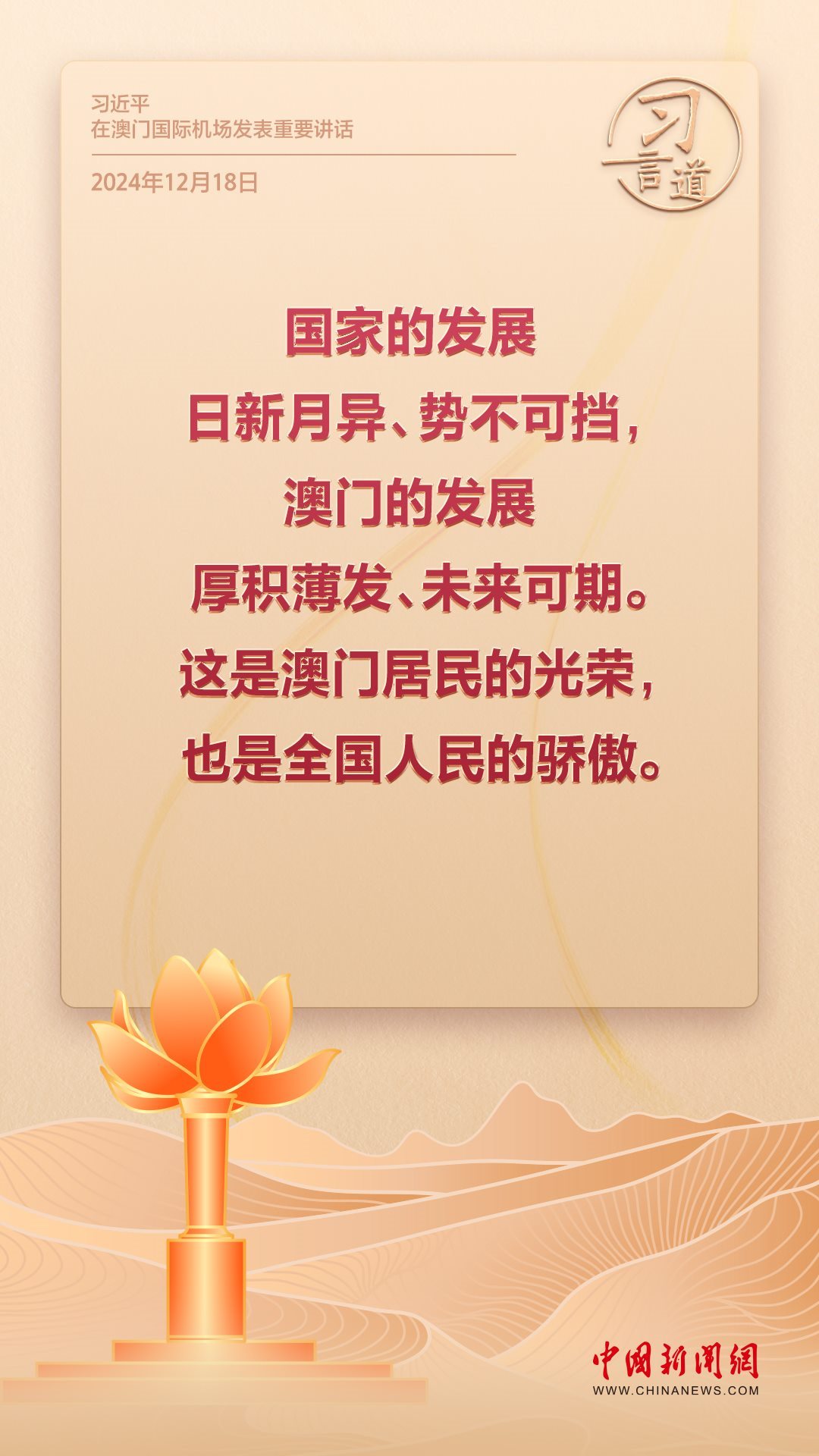 2024年是澳門(mén)回歸祖國(guó)25周年。多年來(lái),習(xí)近平主席始終關(guān)注澳門(mén)經(jīng)濟(jì)社會(huì)發(fā)展、百姓福祉,寄語(yǔ)“澳門(mén)的發(fā)展厚積薄發(fā)、未來(lái)可期”。