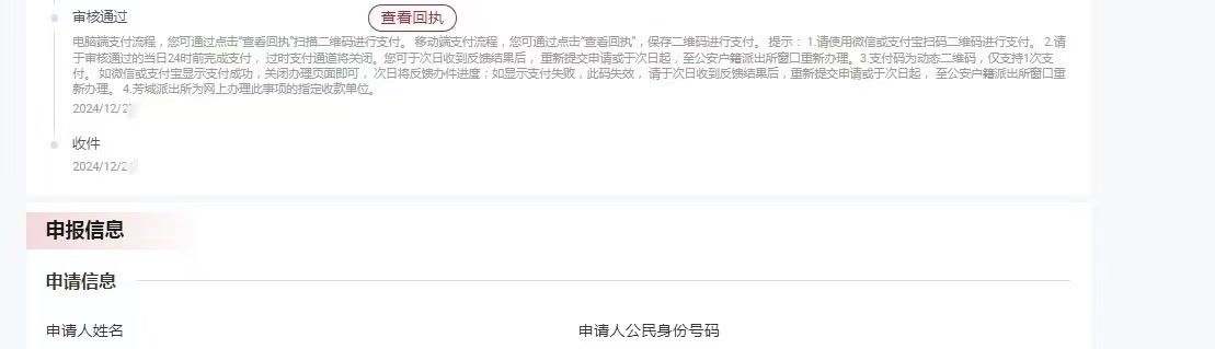 第二步:收到審核通過的短信提示后,使用電腦終端再次登錄北京市政務(wù)服務(wù)網(wǎng)進(jìn)入“個(gè)人空間--我的辦件”,點(diǎn)擊“查看回執(zhí)”,使用微信或支付寶掃描二維碼進(jìn)行支付。支付成功后,等待公安機(jī)關(guān)制作證件。
