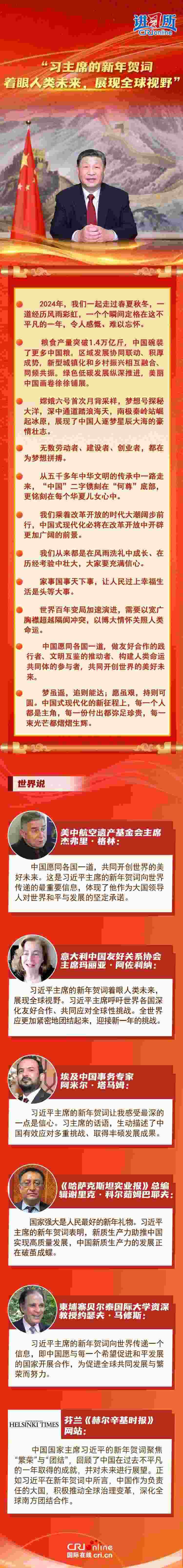 多國(guó)人士認(rèn)為,習(xí)近平主席的新年賀詞著眼人類未來(lái),展現(xiàn)全球視野,體現(xiàn)了作為大國(guó)領(lǐng)導(dǎo)人對(duì)世界和平與發(fā)展的堅(jiān)定承諾。