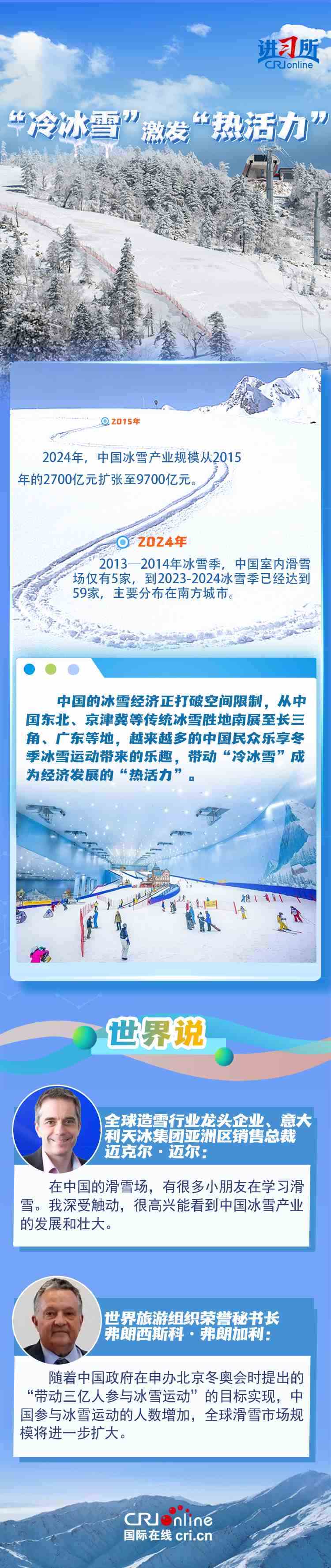 去年年底,中國(guó)國(guó)務(wù)院辦公廳印發(fā)《關(guān)于以冰雪運(yùn)動(dòng)高質(zhì)量發(fā)展激發(fā)冰雪經(jīng)濟(jì)活力的若干意見(jiàn)》,旨在鞏固和擴(kuò)大“帶動(dòng)三億人參與冰雪運(yùn)動(dòng)”成果,以冰雪運(yùn)動(dòng)為引領(lǐng),帶動(dòng)冰雪文化、冰雪裝備、冰雪旅游全產(chǎn)業(yè)鏈發(fā)展,推動(dòng)冰雪經(jīng)濟(jì)成為新增長(zhǎng)點(diǎn)。不少國(guó)際組織、企業(yè)和媒體認(rèn)為,中國(guó)冰雪經(jīng)濟(jì)的蓬勃發(fā)展,不僅帶來(lái)新合作機(jī)遇,更為全球冰雪市場(chǎng)貢獻(xiàn)力量。