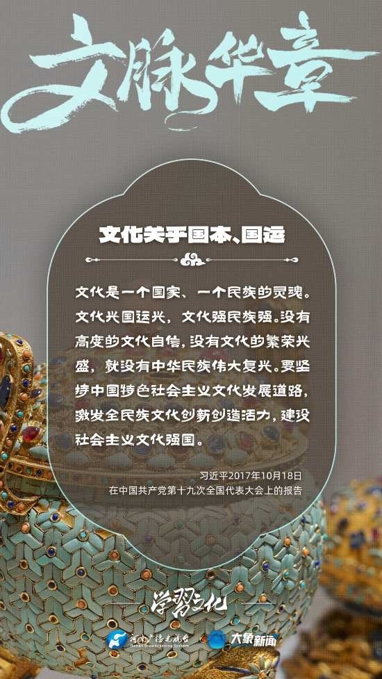 習(xí)近平總書記高度重視文化之于國家、之于民族的重大意義,強(qiáng)調(diào):文化是一個(gè)國家、一個(gè)民族的靈魂。文化興國運(yùn)興,文化強(qiáng)民族強(qiáng)。沒有高度的文化自信,沒有文化的繁榮興盛,就沒有中華民族偉大復(fù)興。大象新聞梳理了習(xí)近平總書記的系列重要論述,我們一起學(xué)習(xí)。