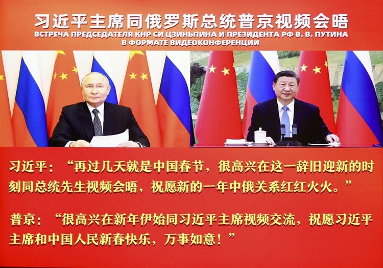 1月21日,中國國家主席習近平在北京同俄羅斯總統(tǒng)普京舉行視頻會晤,兩國元首互致新年祝福。習近平強調(diào),新的一年,我愿同總統(tǒng)先生一道,繼續(xù)引領(lǐng)中俄關(guān)系登高望遠,以中俄關(guān)系的穩(wěn)定性和堅韌性應(yīng)對外部環(huán)境的不確定性,共同促進兩國發(fā)展振興,維護國際公平正義。