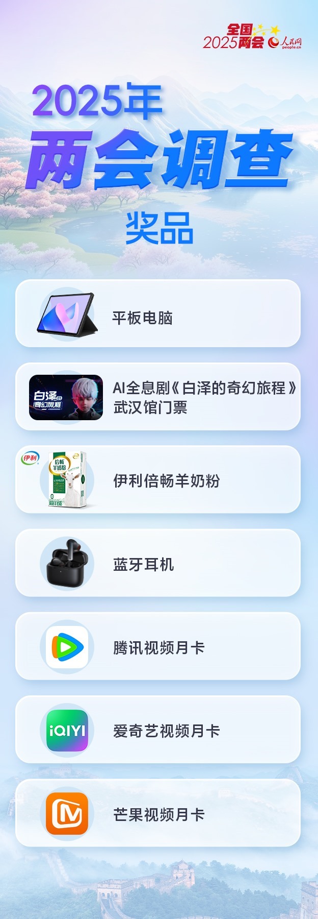 為感謝網(wǎng)友對人民網(wǎng)2025年全國兩會調(diào)查的支持,參與者有機(jī)會抽取精美獎品1份。