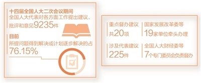 據(jù)全國人大常委會代表工委負(fù)責(zé)人介紹,十四屆全國人大二次會議期間,全國人大代表依法履職盡責(zé),對各方面工作提出建議、批評和意見9235件,交由213家承辦單位研究辦理,其中,重點督辦建議共20項。