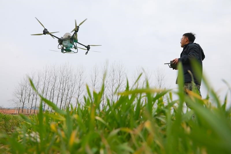△2025年2月14日,在浙江杭州市臨安區(qū)天目山鎮(zhèn)“天目糧倉”糧食功能區(qū),農(nóng)機(jī)人員遙控植保無人機(jī)給小麥?zhǔn)┓省?/span>