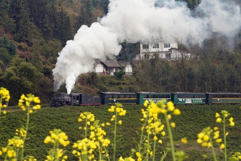 △2025年2月14日,四川樂山市犍為縣菜子壩景點(diǎn)試種的早季油菜花進(jìn)入盛開期,蒸汽小火車穿越油菜花海,吸引不少游客前來觀看。