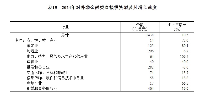 全年對(duì)外非金融類直接投資額10245億元,比上年增長11.7%,折1438億美元,增長10.5%。其中,對(duì)共建“一帶一路”國家非金融類直接投資額2399億元,增長6.5%,折337億美元,增長5.4%。