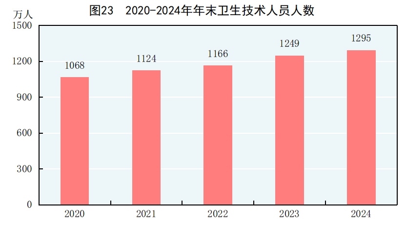 年末全國共有醫(yī)療衛(wèi)生機(jī)構(gòu)109.2萬個(gè),其中醫(yī)院3.9萬個(gè),在醫(yī)院中有公立醫(yī)院1.2萬個(gè),民營醫(yī)院2.7萬個(gè);基層醫(yī)療衛(wèi)生機(jī)構(gòu)104.0萬個(gè),其中鄉(xiāng)鎮(zhèn)衛(wèi)生院3.3萬個(gè),社區(qū)衛(wèi)生服務(wù)中心(站)3.7萬個(gè),門診部(所)39.8萬個(gè),村衛(wèi)生室57.1萬個(gè);專業(yè)公共衛(wèi)生機(jī)構(gòu)9217個(gè)(不含衛(wèi)生監(jiān)督所、中心),其中疾病預(yù)防控制中心3429個(gè)。衛(wèi)生技術(shù)人員1295萬人,其中執(zhí)業(yè)醫(yī)師和執(zhí)業(yè)助理醫(yī)師505萬人,注冊(cè)護(hù)士584萬人。醫(yī)療衛(wèi)生機(jī)構(gòu)床位1037萬張,其中醫(yī)院818萬張,鄉(xiāng)鎮(zhèn)衛(wèi)生院151萬張。全年總診療人次[79]101.1億人次,出院人次[80]3.1億人次。