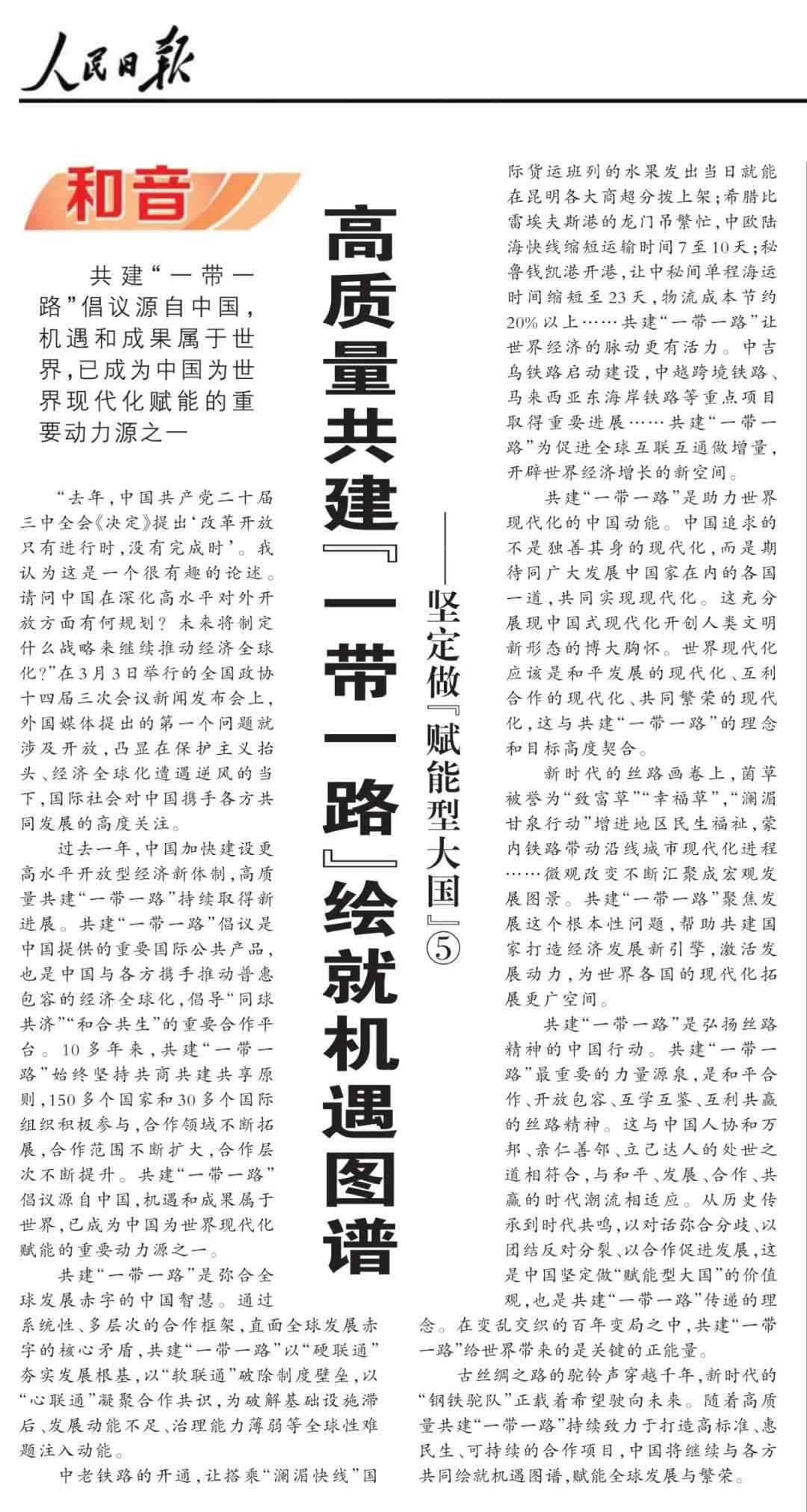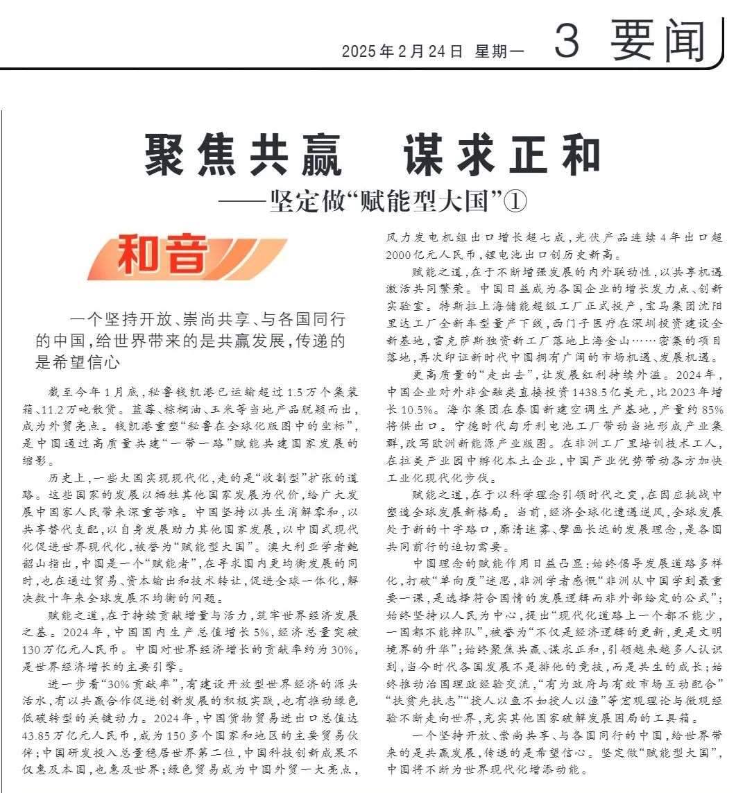 近期,《人民日?qǐng)?bào)》“和音”欄目推出“堅(jiān)定做‘賦能型大國(guó)’”系列評(píng)論,圍繞科技創(chuàng)新、開(kāi)放共贏、綠色轉(zhuǎn)型、高質(zhì)量共建“一帶一路”、多邊治理等熱點(diǎn)議題,從不同角度闡釋中國(guó)何以成為一個(gè)“賦能型大國(guó)”的深層邏輯,展現(xiàn)中國(guó)始終秉持構(gòu)建人類(lèi)命運(yùn)共同體理念,不斷以中國(guó)式現(xiàn)代化為世界現(xiàn)代化賦能的大國(guó)擔(dān)當(dāng)。