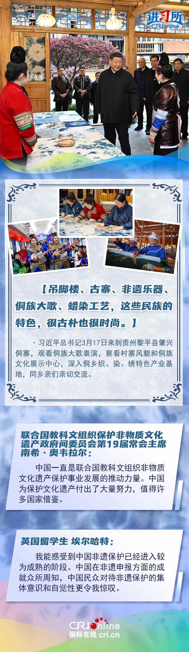 習近平總書記近日赴貴州、云南考察。他走進民族特色村寨、歷史文化古城,心系歷史文化遺產(chǎn)保護和文旅融合發(fā)展。習近平特別叮囑當?shù)毓賳T和群眾,既要保護有形的村落、民居、特色建筑風貌,傳承無形的非物質(zhì)文化遺產(chǎn),又要推動其創(chuàng)造性轉(zhuǎn)化、創(chuàng)新性發(fā)展。