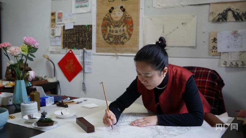 喬蘭蓉正在勾繪《一團(tuán)和氣》線稿(央廣網(wǎng)記者 王紀(jì)民 攝)