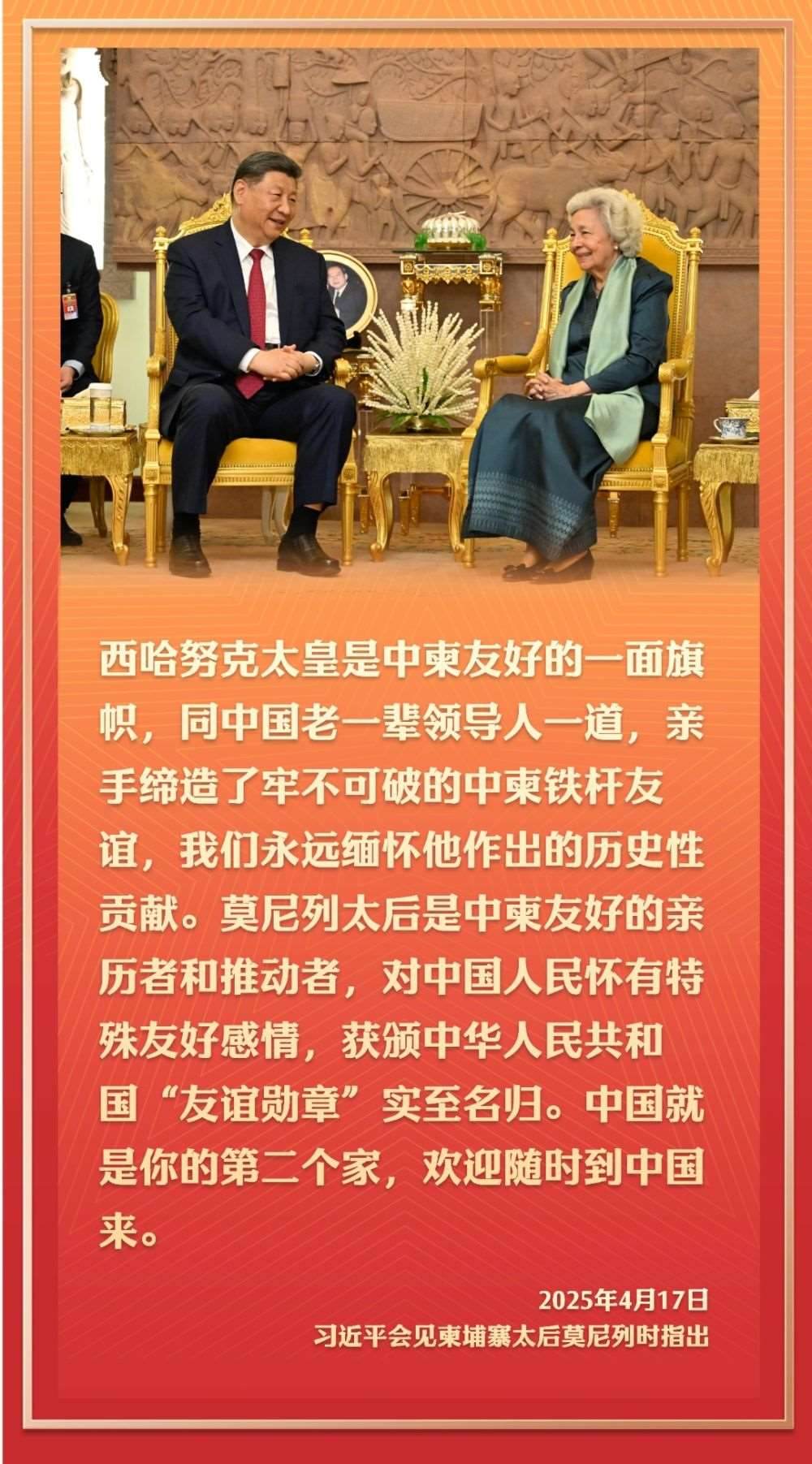 2016年10月13日,國家主席習(xí)近平在金邊看望柬埔寨太后莫尼列。莫尼列太后特意請(qǐng)習(xí)近平在西哈努克太皇生前常坐的椅子上就座。