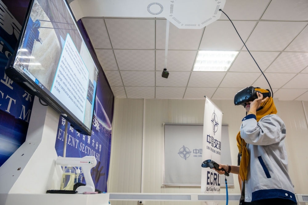 2021年11月9日,在位于彭亨州馬蘭的馬來西亞東海岸鐵路項目安全教育培訓中心,一名工作人員借助VR技術(shù)學習安全知識。為確保項目安全推進,中國交通建設集團有限公司在承建的馬東鐵項目沿線設立了多個虛擬現(xiàn)實和實體體驗安全教育培訓中心,借助沉浸式3D技術(shù)與VR設備,模擬了近百種潛在的施工現(xiàn)場危險情況,有效提升了項目員工的安全意識和技能水平。