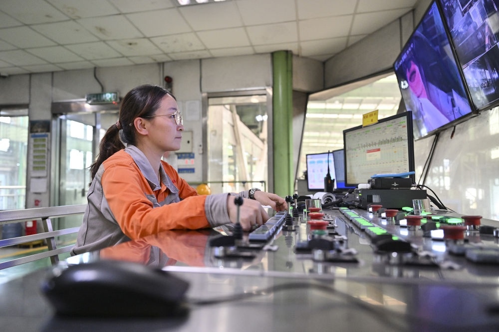2024年6月13日,在馬來西亞彭亨州馬中關丹產(chǎn)業(yè)園聯(lián)合鋼鐵(大馬)集團公司工廠,中國員工在智能控制室工作。